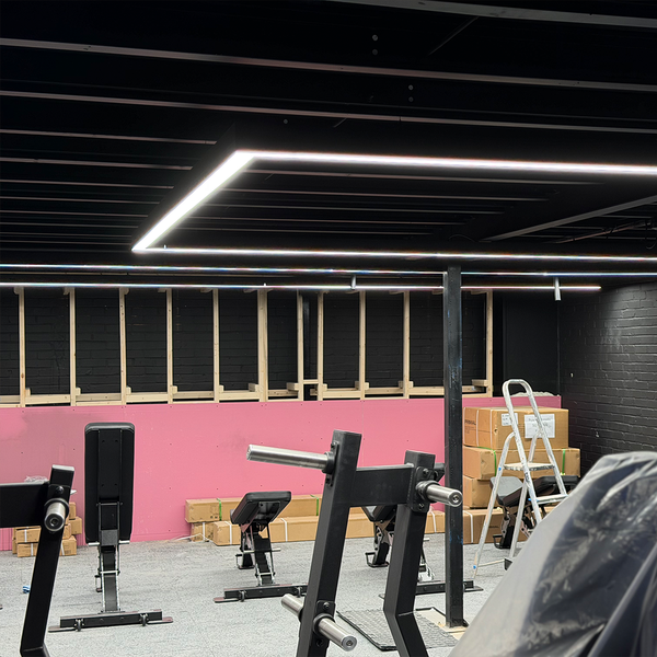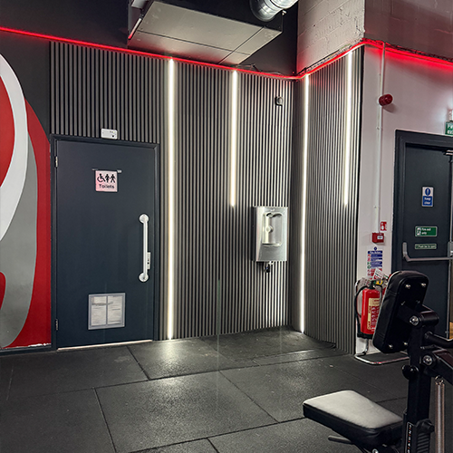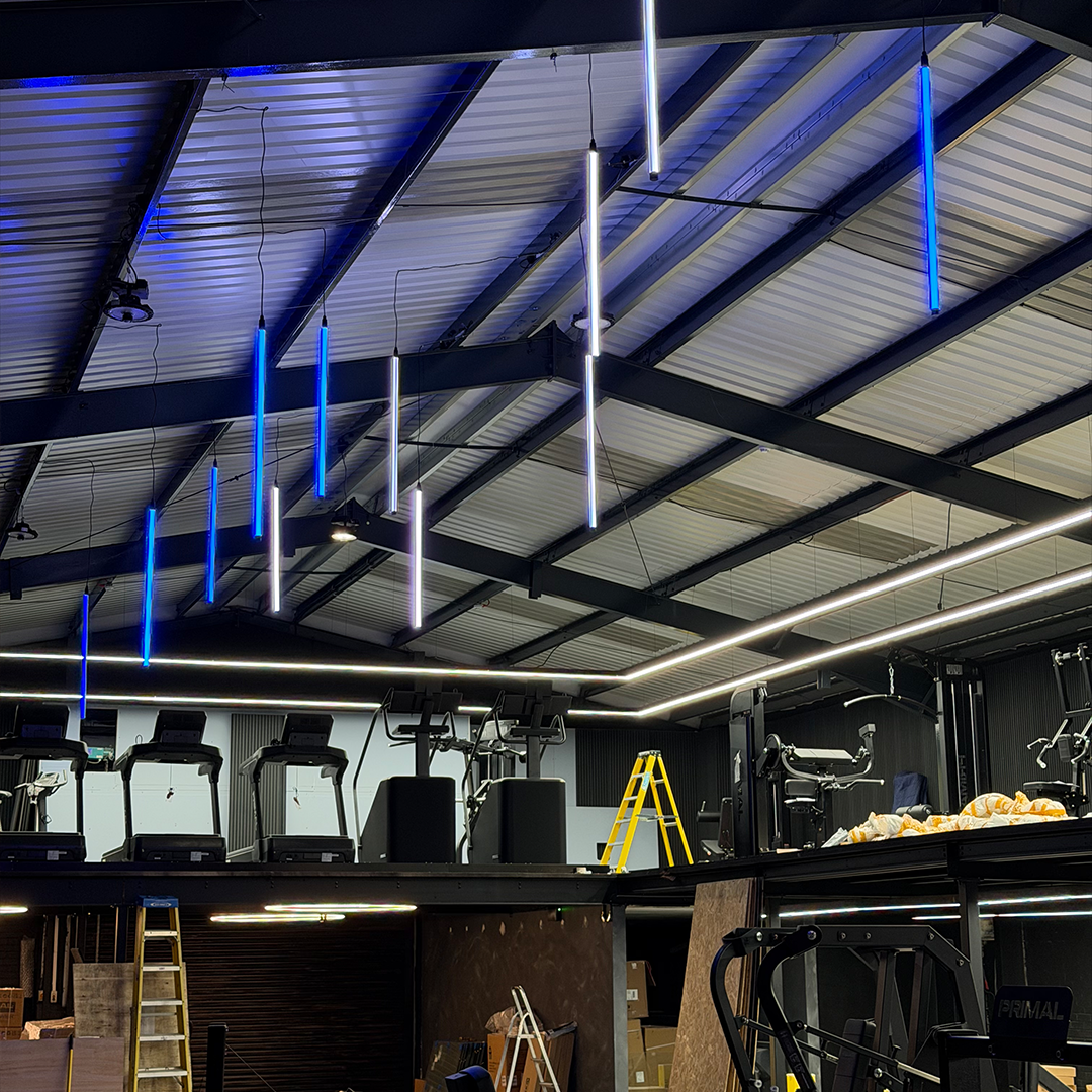 Feature lighting was a key part of the project, with linear LED systems, suspended halo fittings and programmable LED feature lighting installed to create a modern, high-impact training environment. The lighting and power systems were designed to be both visually striking and fully functional for a busy commercial gym environment.