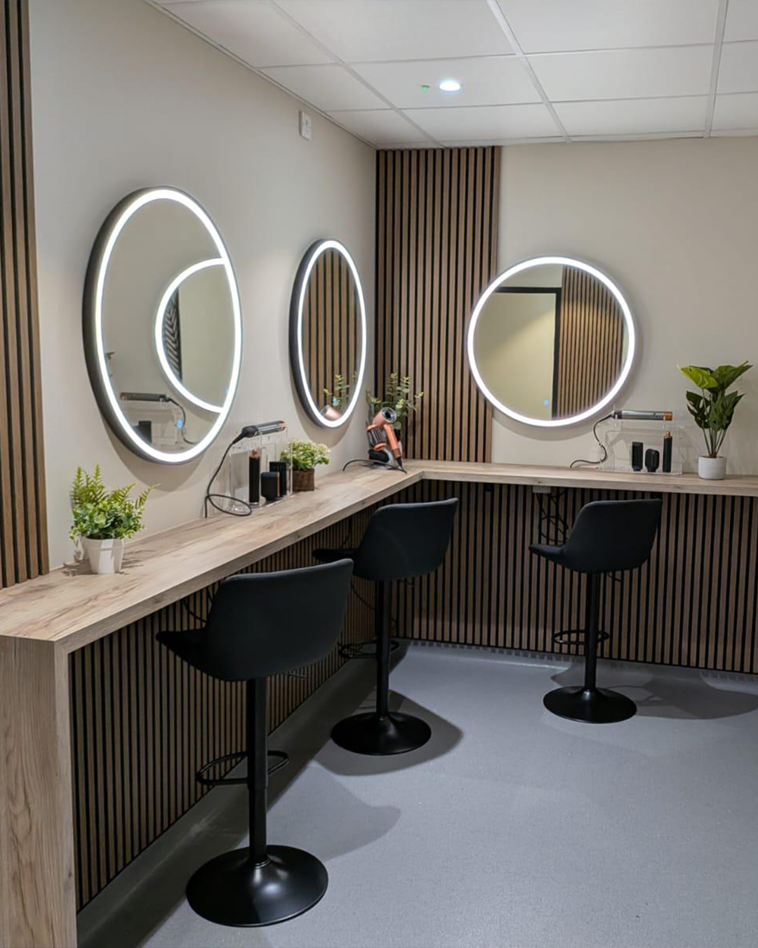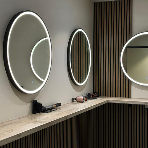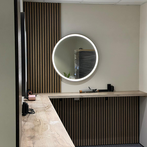 Works included the installation of illuminated feature mirrors, dedicated power supplies for hair styling equipment and clean, concealed cable management throughout the vanity area. All installations were completed with appropriate circuit protection and local isolation to ensure safety and long-term reliability within a commercial setting.